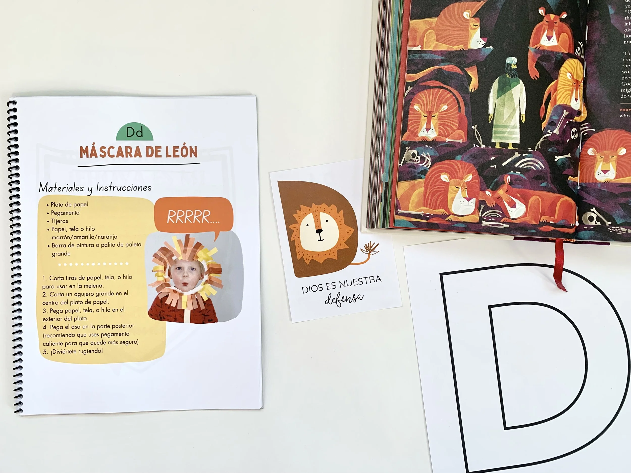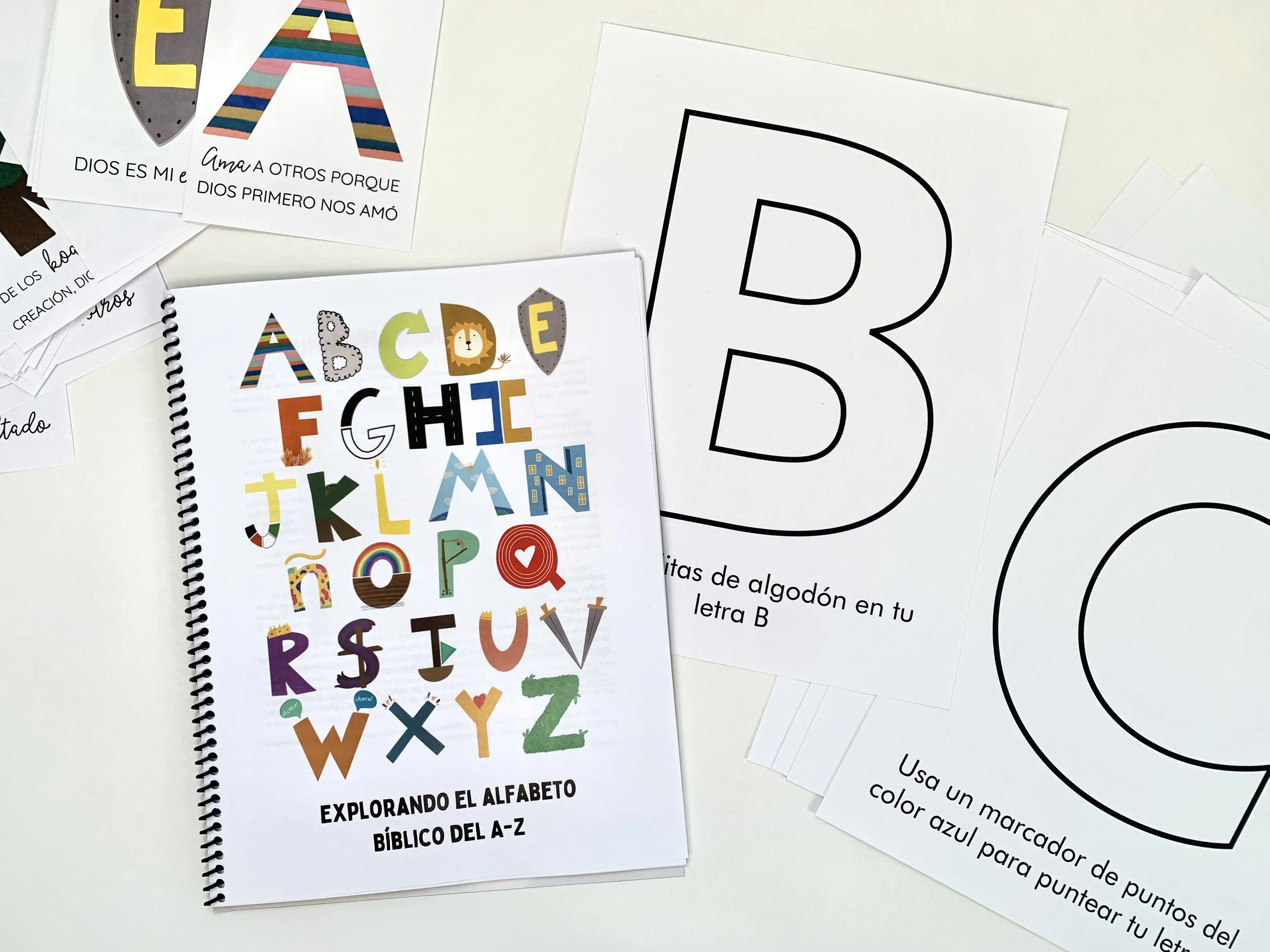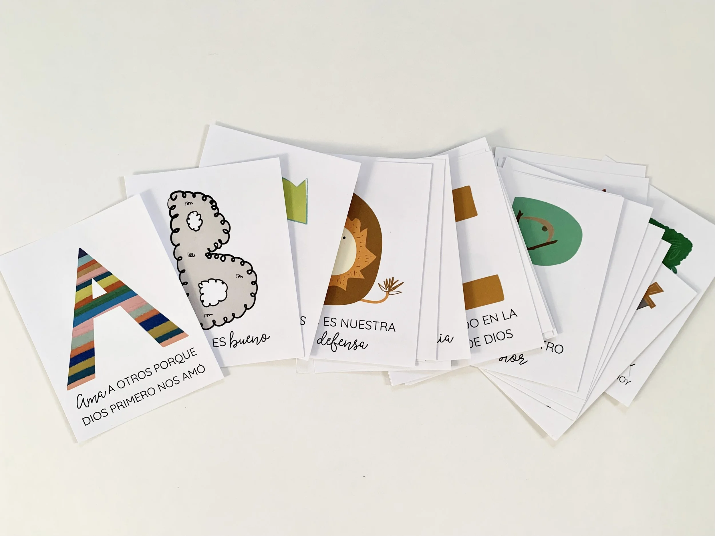 Spanish Alphabet Cards. These are included in the curriculum too, but if you didn’t want to commit to a full curriulum, these are a great tool to use with your little ones. There is a letter and Bible truth on the front. On the back, there is a Bible reference to read as well as a verse to learn/read. Perfect for morning time or short family devotions!